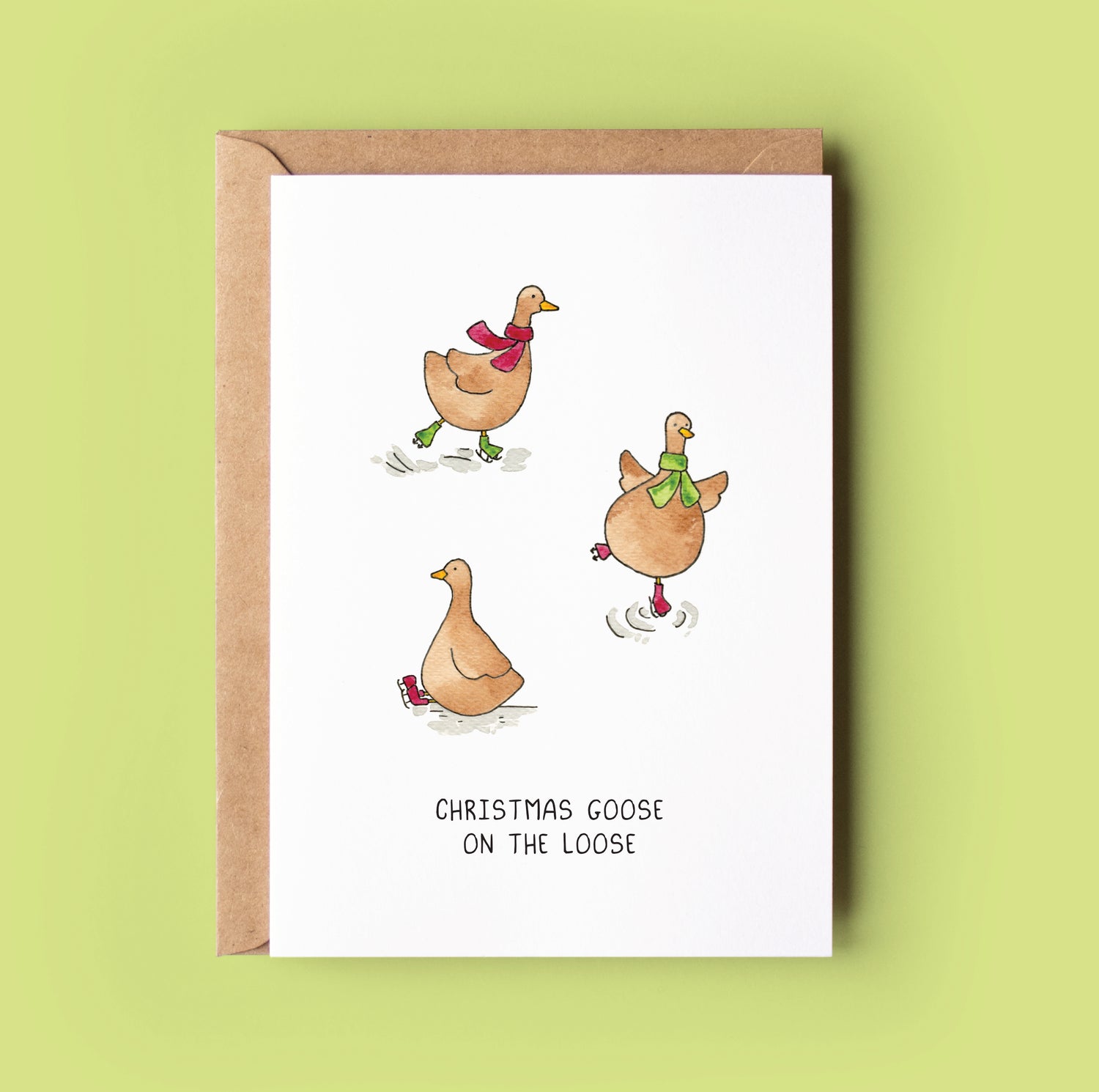 Kaartje kerst schaatsende ganzen